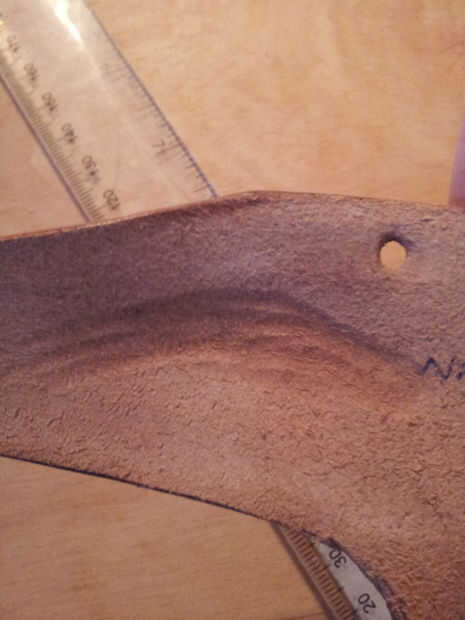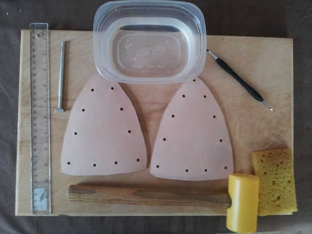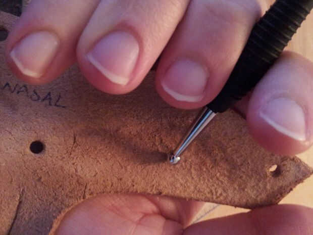 Para hacer el repujado, volver a mojar el cuero si necesita y luego colocar la pieza de frente en la mano como en la imagen - esto actuará como especie de un cojín o un pote de tono si has hecho persiguiendo metal antes. Entonces usando una bola modelando la herramienta, empuje la piel hacia abajo y dibujar el contorno de una ceja. Debe sentir el cuero estirando un poco, y siempre es una buena idea para voltearlo de vez en cuando para ver cómo se ve. Una vez que estés feliz con lo que estás viendo, llenar en el medio y empuje tan adelante como usted tiene gusto. Repita para el otro lado.