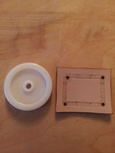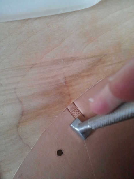 Coge el contenedor de agua y esponja y luego humedezca el cuero completamente. Una vez que el cuero ha regresado cerca de su color natural (pero sigue siendo fresco y húmedo al tacto) Marque una línea en el lado del grano utilizando un punzón rasguño o herramienta de modelado. Luego la línea hasta el sello de usa para que la izquierda y la parte inferior derecha las esquinas superiores de la estampilla toquen la línea trazada y golpee firmemente varias veces, que se inclina el sello a un lado y el otro para asegurarse de que está hecha una impresión clara en la piel. Bajar la línea y hacer otra impresión que las líneas hasta el final de la primera, podrá sentir las zonas elevadas de la estampilla caber dentro de la impresión. Continuar sellado sigue las impresiones hasta que haya cubierto el área que será visible una vez montadas. Que tenga que mojar periódicamente el cuero se seca con el tiempo-cuero seco no acepta el sello así, y realmente puede crear grietas en la piel.