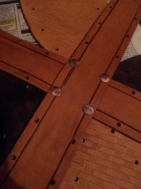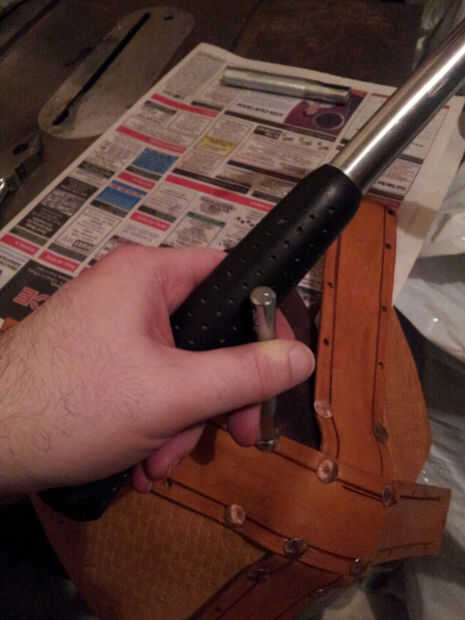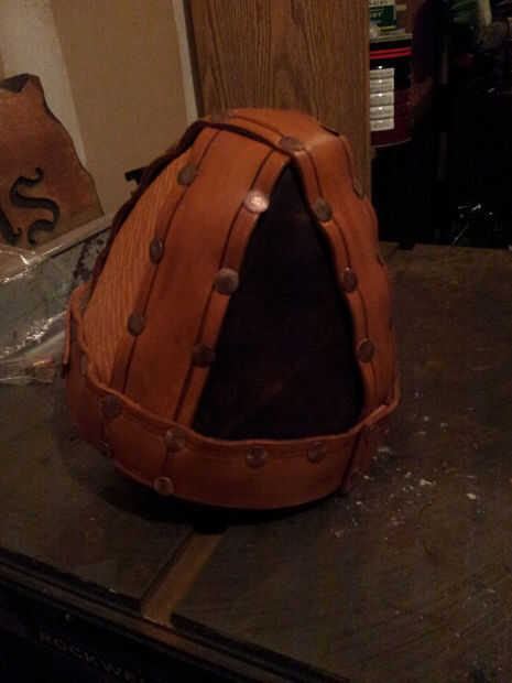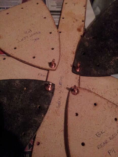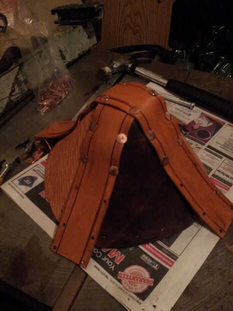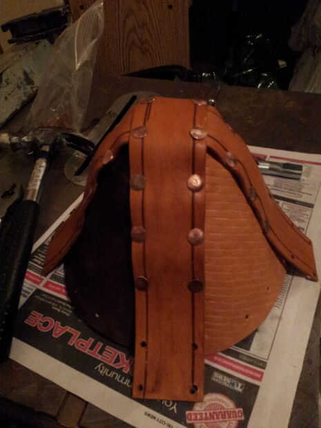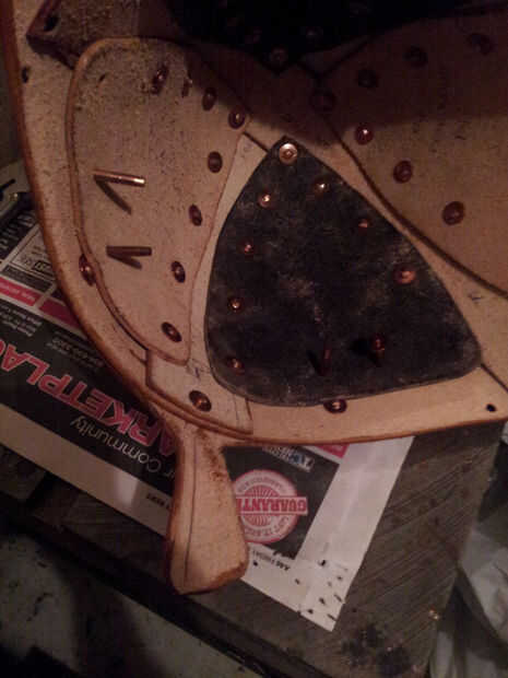 Cuando ves en las fotos puede decir que he puse los remaches con los postes en el interior del casco -, podría tener los postes sobresalen en el lado de grano, pero personalmente como el limpiador miro de la parte inferior del remache en la parte exterior del casco. Si usted decide hacer lo mismo, definitivamente empezaría ajuste remaches en la parte superior del casco y su forma de trabajo hacia abajo. Cuando el casco se cierre para arriba, será más difícil montar el martillo y remache setter dentro.