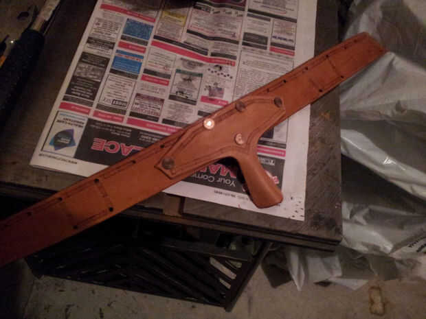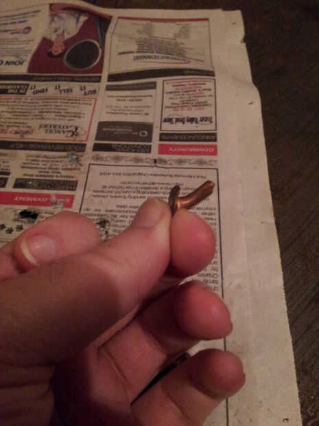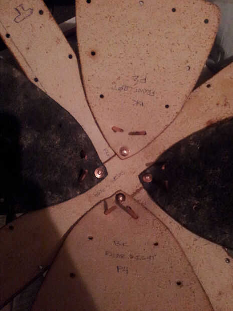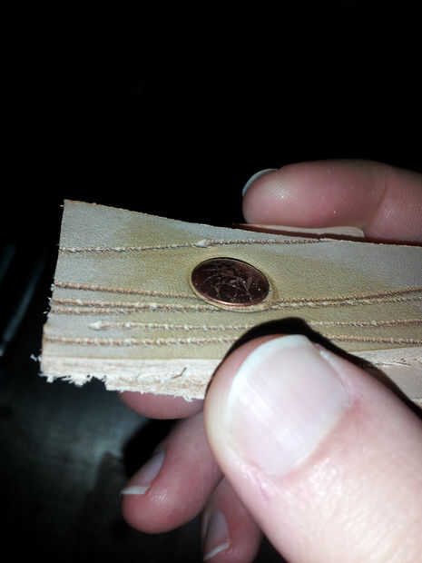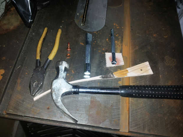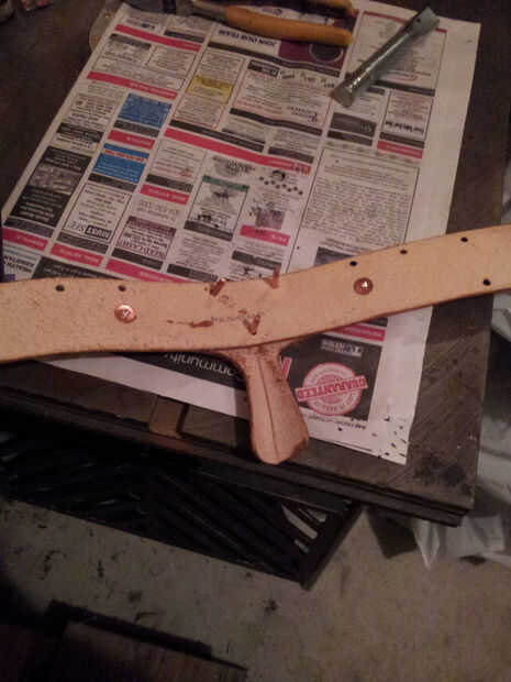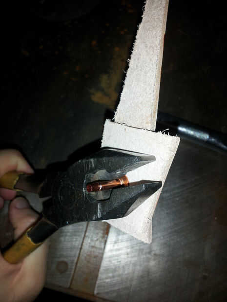 Haz tus remaches, martillo, y cortador de alambre. Es la hora de Asamblea! Voy a hacer una demostración rápida algunos desechos de cuero para mostrar cómo establecer correctamente los remaches. Use gafas de seguridad y mascarilla contra el polvo cuando haces las presentación - cobre virutas en los ojos y cobre polvo en los pulmones no es agradable, me imagino.