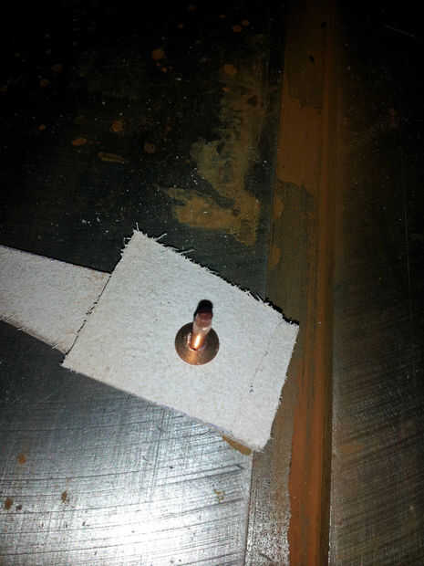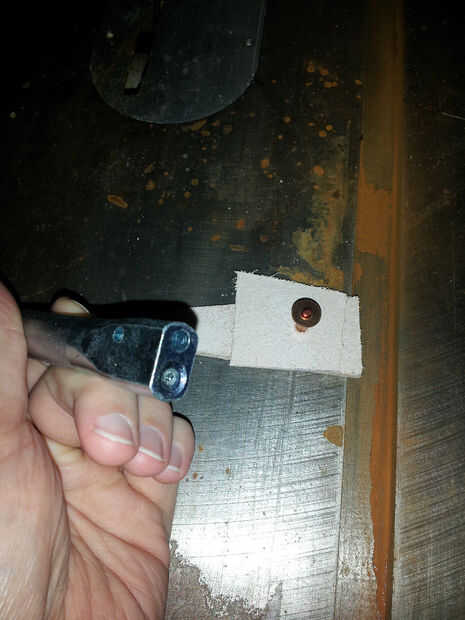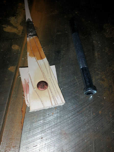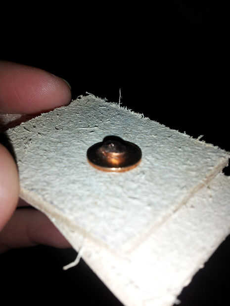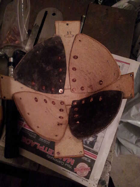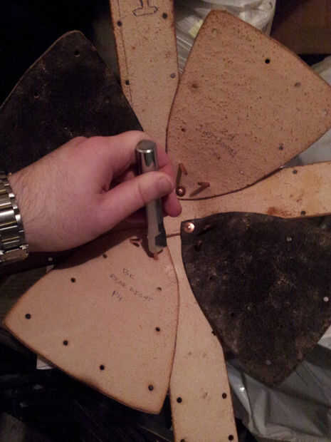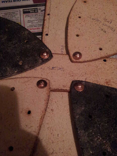 - Enrosque el remache a través de las piezas de cuero y coloque sobre una superficie resistente - siempre debe tener algo de metal para fijar los remaches, como un anvil (yunque de joyero podría trabajar). De hecho tengo acceso a una sierra circular metal, por lo que es lo que usé.
