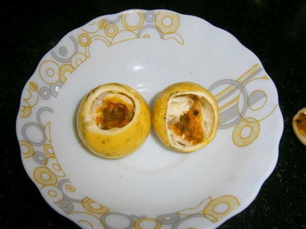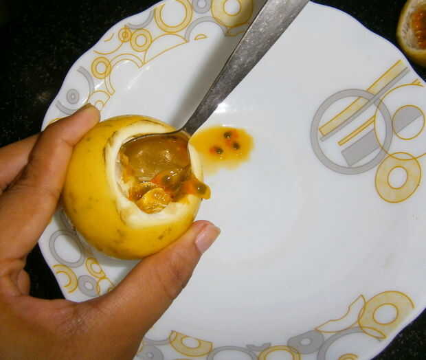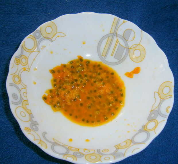 Sacar la pulpa de la fruta de la pasión en un vaso.