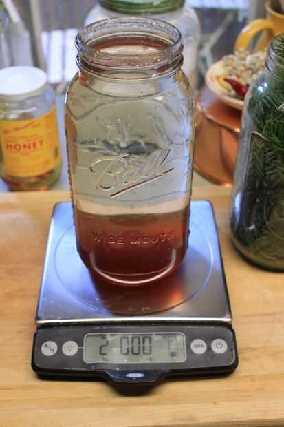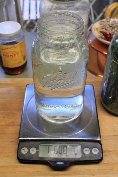 Si tienes una balanza, pesar el agua y la miel en una proporción 4:1. Si no es así, esta relación resulta ser aproximadamente una libra de miel por medio galón de agua. Hacer lo suficiente para cubrir cómodamente cualquier agujas cantidad de redwood (u otras coníferas) han reunido.