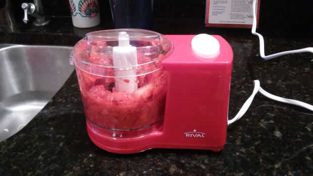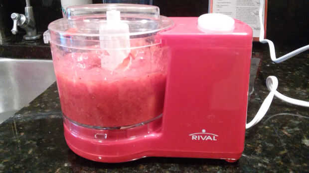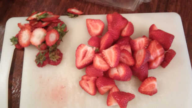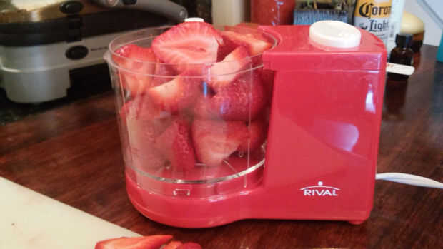 Yo primero corta las fresas en cuartos antes de triturar en un helicóptero. También puede utilizar una batidora para este paso.