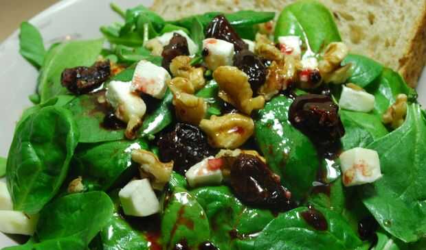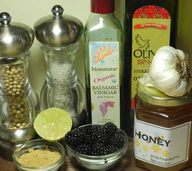Simplemente puré de moras y mezclar todos los ingredientes. Rocíe sobre la ensalada.