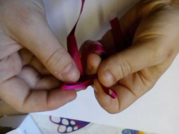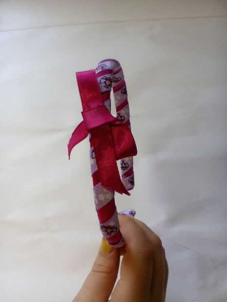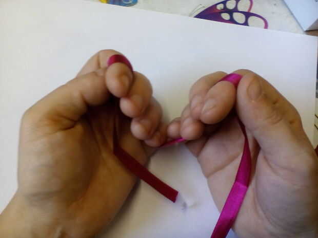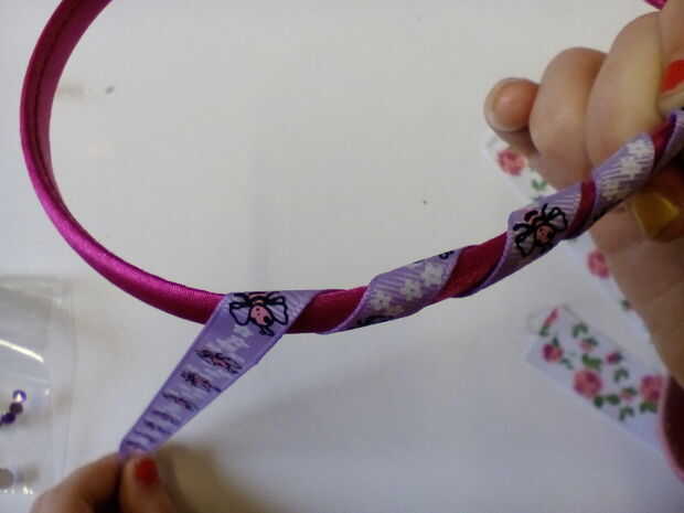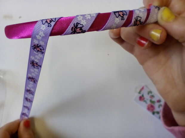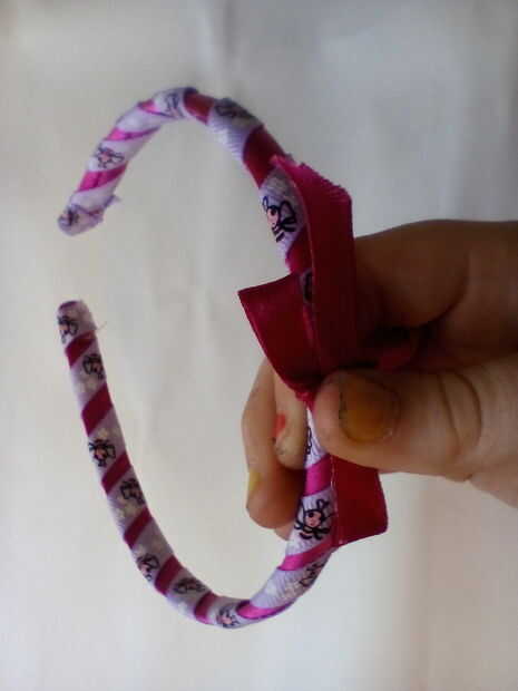 Para hacer éste, he utilizado mi cinta favorita, que es lila y tiene abejas en él. Lo envolvió para que pudiera ver el satén rosa de la diadema en rayas. Luego añadí un lazo rosa a él. Para hacer el arco, hacen dos bucles, uno en cada mano. Luego hacer un nudo, como el primer nudo haces al atar sus cordones. Cuando usted Tire firmemente se obtiene un arco realmente impresionante como la magia! Este es mi favorito hairband.