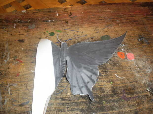Entonces de origen un dibujo de mariposa para escalar y hacer una plantilla fuera. Usé coral draw para esto ya es lo que tenia instalado. Sólo se necesita el cuerpo y un ala. Luego puede ser impresa y sorteo alrededor en su registro con el lápiz, que entonces movido de un tirón para sacar la otra ala. (No tengo ni idea si las mariposas son realmente simétricas pero la mía es). El cuchillo caliente toma alrededor de cinco minutos a calentarse lo suficiente como para cortar, y luego trabajar en secciones para cortar su diseño.