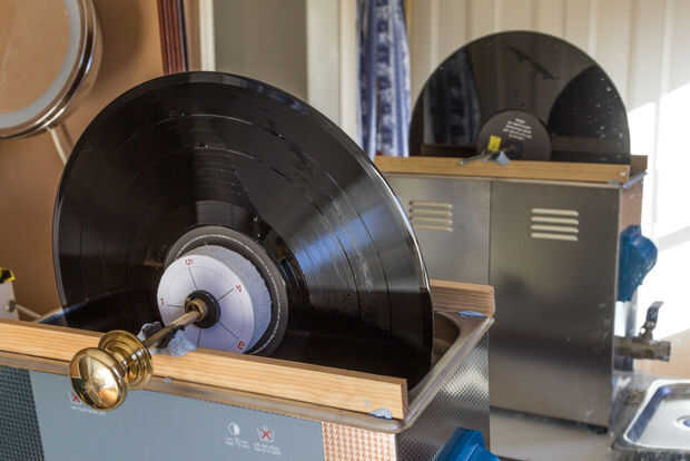 Limpieza de discos de vinilo con un limpiador ultrasónico. Esto garrapatas todas las cajas con respecto a sin contacto con la superficie del disco y se puede limpiar muy a fondo. Las partículas de polvo microscópicas son removidas de la parte inferior de la ranura de discos. El contacto menos físico que nada tiene con la cara del disco, los métodos mejores y más limpieza requieren algún tipo de roce o cepillado. En un mundo ideal, el único elemento que toque la superficie de un registro debe ser un lápiz. Limpieza por ultrasonidos es sin contacto.