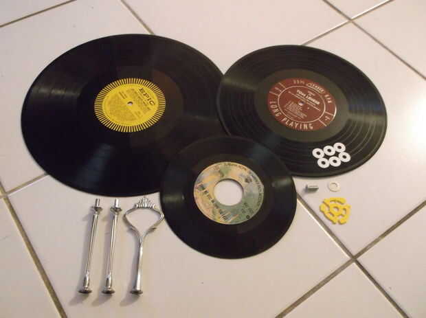 Tres discos de vinilo. Deben ser de diferentes tamaños, así que necesitarás un 78, 33 1/2 y 45. Encontré minas en el ejército de salvación para $.50 un pedazo.