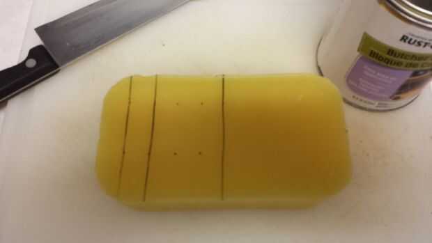 Elegí una combinación de aceite mineral (aceite de bloque de carnicero) y cera de abejas. Es un sello de fuerte y de muy bajo mantenimiento. También ayudará a llenar cualquier menores grietas y huecos que tenga su bandeja. El acabado ceroso también sacaré ese color púrpura de las manchas de vino. Ambos pueden encontrarse en la elaboración de tiendas como Michaels. Encontré la receta en este sitio. La receta pide 1/5 del volumen de cera de abejas al aceite mineral. Tenía 16 fl oz Contenedor de aceite del bloque de carnicero y sólo utiliza la mitad en caso de en mal estado el sellador. Y compré una barra de cera de abejas de 15 oz. Aquí está mi matemáticas: