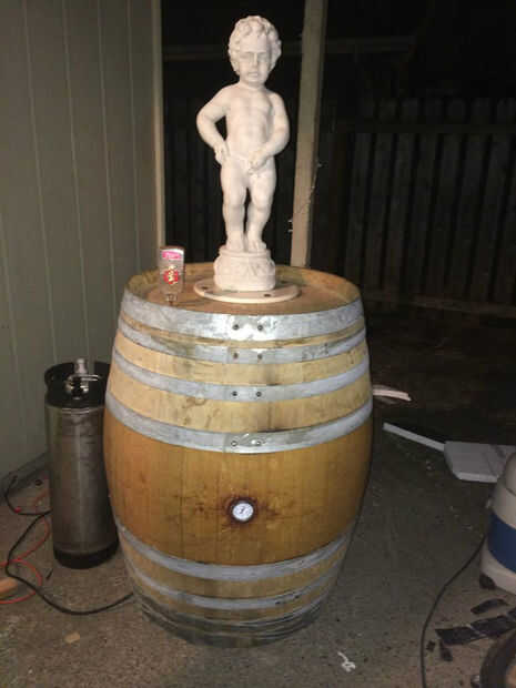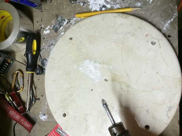 Usé una estatua de hilo manneken pis como mi grifo. Está disponible en la mayoría de los ofertantes de jardín o amazon/ebay. Para cubrir el agujero de acceso pegado a un tablero de mármol de queso/pastel de 12". Usé pegamento de E-6000, este material funciona muy bien y seca clara. Antes de pegar la estatua a la tabla de quesos Asegúrese de perforar un orificio para el tubo de goma que sale de la estatua que es donde fluye la cerveza. Una broca de pala facilita la perforación del granito bastante y no hay sople a través de la parte posterior de los orificios.