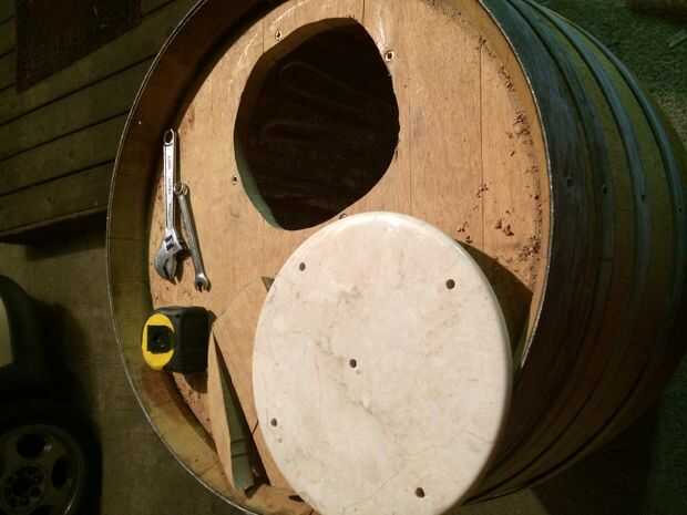 Una vez tienes el barril aislado y los componentes del refrigerador en el lugar, armar nuevamente el barril. Orificio de acceso circular lo suficientemente grande como para caber un barrilete de cornelius a través.
