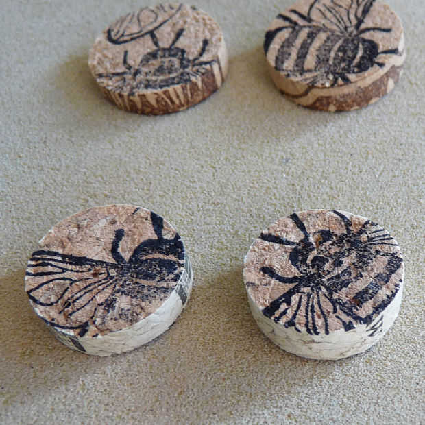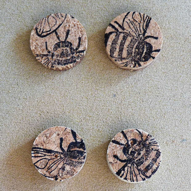 Use un sello de goma y tinta negra permanente para las abejas de sello sobre el corcho. Sello de ambos lados.