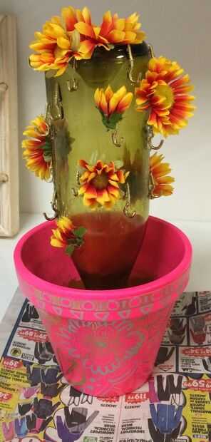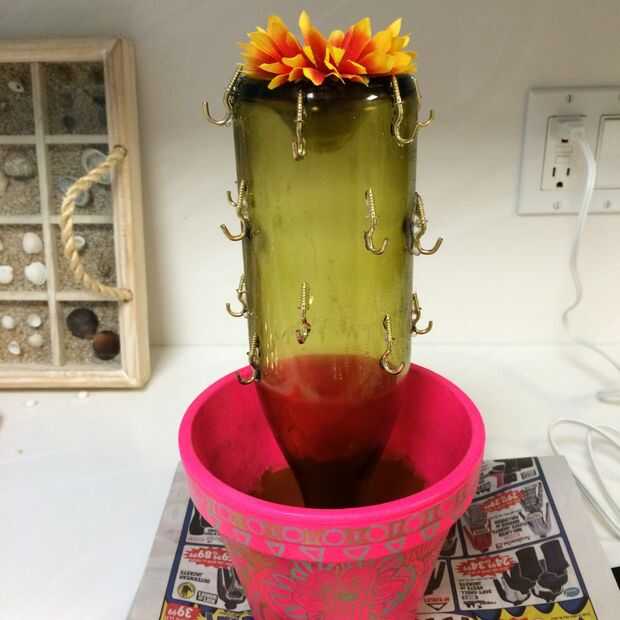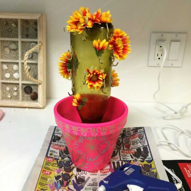 Utilice pegamento caliente o pegamento alternativo para adherirse más flores en su botella. Tratar de difundir hacia fuera en forma natural como si fuera un cactus real sin dejar que las flores obstaculizar colgante joyas en los ganchos, si desea hacerlo más tarde.