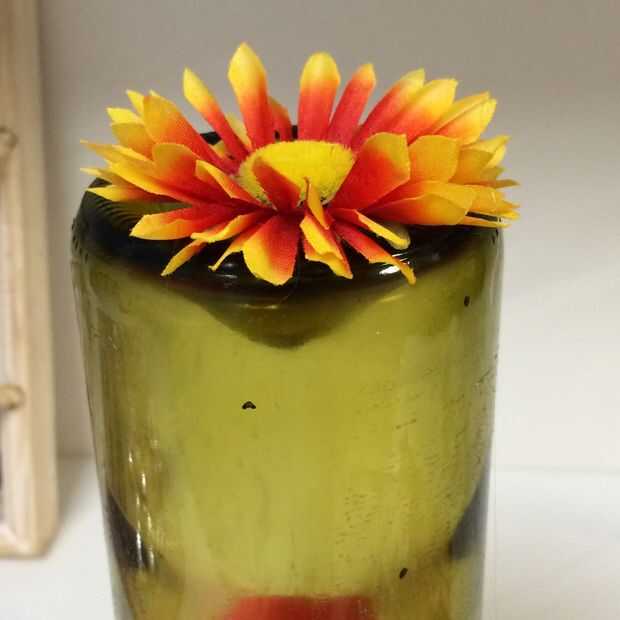 Utilice pegamento caliente o alternativa cola a cola la flor más grande en la parte superior de tu cactus botella de vino base (tan realmente la parte inferior de la botella de vino)