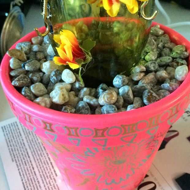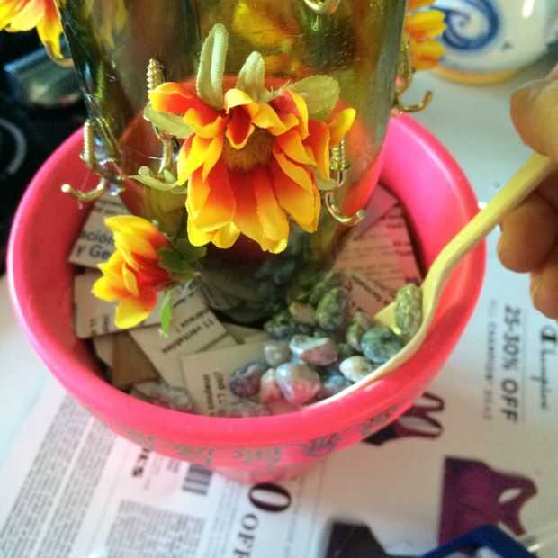 A continuación, cuchara las rocas sobre la cartulina en el bote. Rellene todo el espacio alrededor de la botella de vino. Asegúrese de rellenar todo el espacio de la botella de vino al borde de la maceta de terracota.