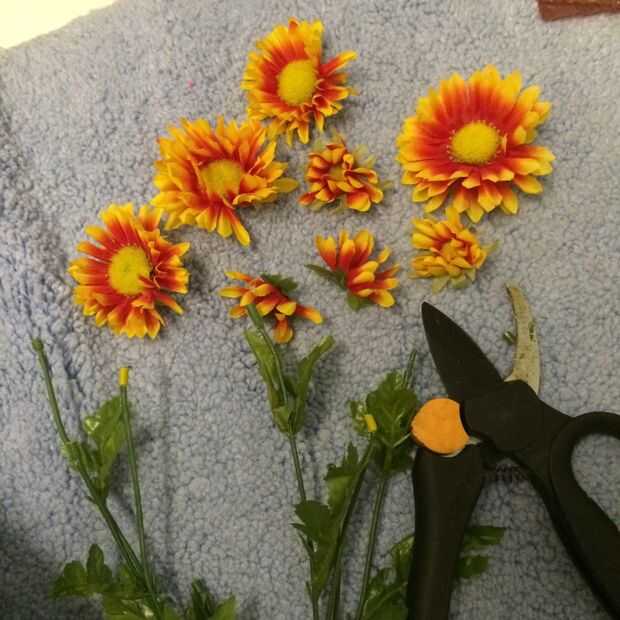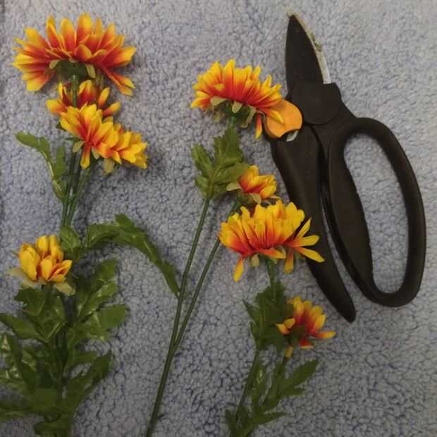 Utilice cortadores de alambre o cuchillas de jardinería para cortar las flores de los tallos. Corte como la flor como sea posible porque eso les hará más plano a los cactus cuando se pegan en la botella.