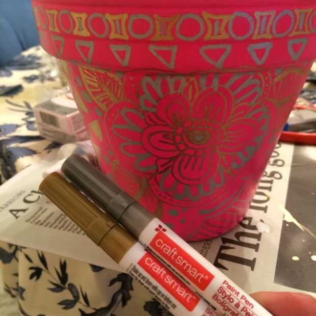 Si tu olla es seca de la capa base, utilizar sus plumas de la pintura para dibujar en su maceta pintada.