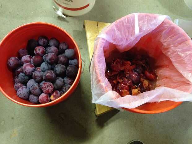 Tomar la bolsa de filtrar y poner en un cubo. Con la mano, aplastar las ciruelas y quitar las piedras del hoyo. El objetivo es mantener todo pero los hoyos y los tallos. Me tomó alrededor de una hora para procesar 20 libras mantenga el jugo, pieles y pulpa para el siguiente paso.