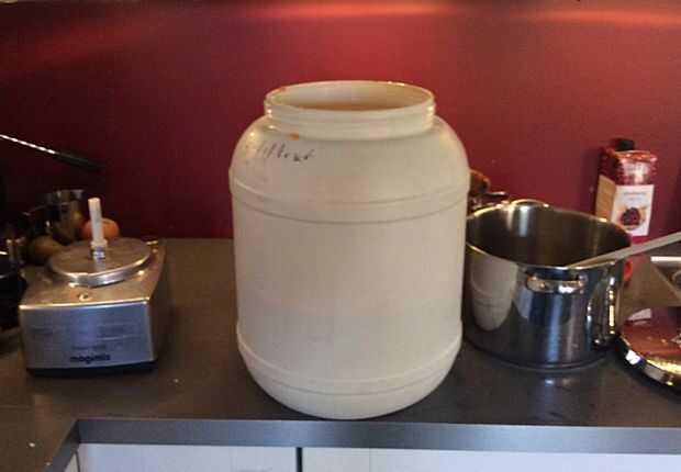 -Un recipiente de fermentación, 200% del tamaño de su cantidad de vino. Si quieres hacer 10 litros de vino necesita un recipiente de 20 a 25 litros. Ya que se fermentan la celulosa un recipiente con una abertura grande es ideal. Si se usa jugo de cualquier botella grande va a hacer. Simplemente puede usar un cubo de plástico de grado de alimentos grande para esto, pida su cafetería local, muchos de ellos tienen izquierda de la mayonesa u otras salsas. Necesita el volumen adicional ya que la fermentación produce espuma. Esto se sale por el colector y crear un desastre.