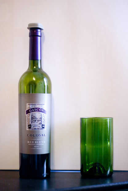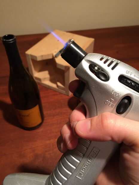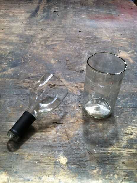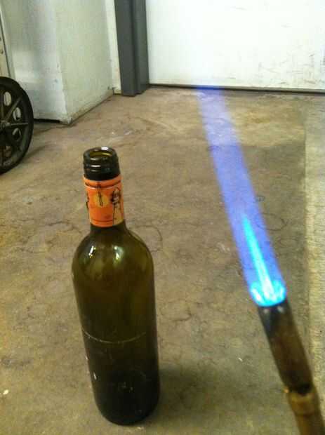Utilizando la plantilla, aplique presión uniforme mientras gira la botella de vino. Tomé las etiquetas de las botellas por remojo en la bañera. Luego vino el verdadero trabajo - encontrar la fuente de calor adecuada para partir la botella.