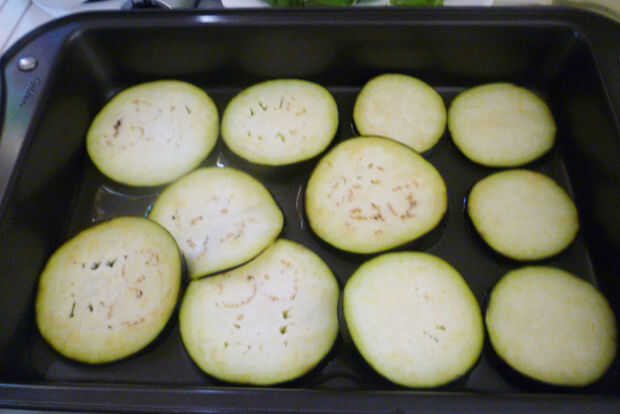 Lo que usted necesita.3-4 huevosAceite de olivaQueso Mozzarella ralladoSalsa de tomate2 berenjenasAjoMigas de panPaso 1:Cortar la berenjena en rodajas como se muestra en la imagen.Paso 2:Poner el huevo en un cuenco y el pan rallado en un plato grande