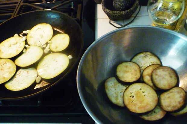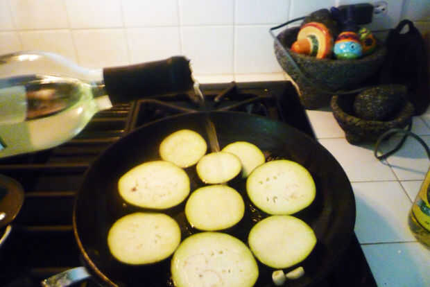 6. Una vez que se doran las rodajas de berenjena Coloque las siguiente rebanadas previamente remojadas en la sartén, agregando vino según sea necesario.