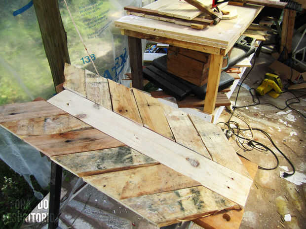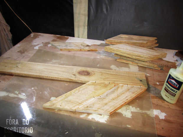 Después de lijar, pegar todo junto. Probé muchos métodos diferentes para pegar los pedazos juntos, pero ninguno de ellos realmente funcionó hacia fuera porque las piezas eran demasiado diferentes unos de otros, e incluso cortarlos a la longitud exacta de la misma todavía no se sentaría justo a la otra, así que decidí utilizar grapas para sujetar todo en su lugar.