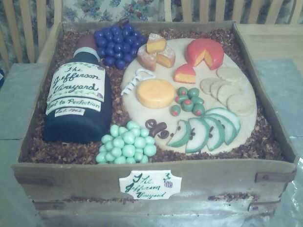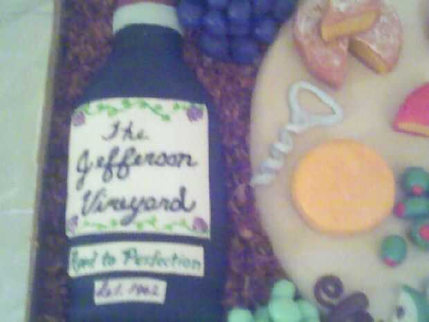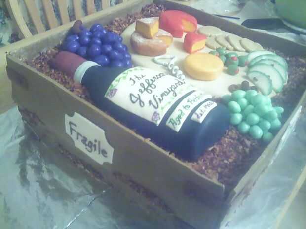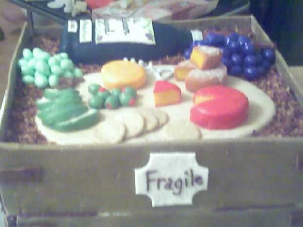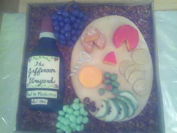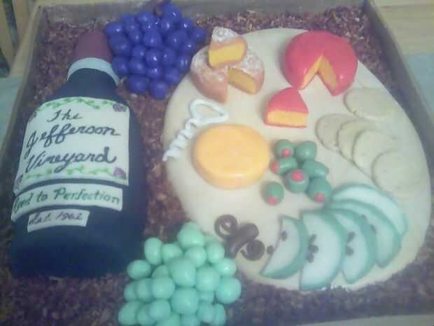 Botella de vino, uvas, sacacorchos, tabla de cortar, queso, galletas saladas y aceitunas eran todos esculpida a mano de fondant (hacemos nuestro propio fondant de malvaviscos y color con el colorante de gel). Para los objetos de dos colores (las ruedas de queso y manzanas), forma el interior de color, entonces envuelto un segundo color alrededor de la primera.