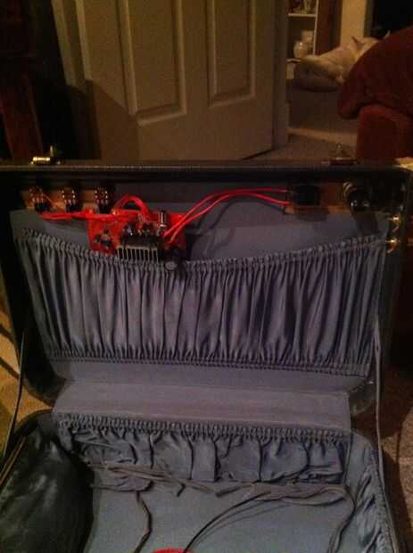 Luego desmontar mi módulo de receptor de música Bluetooth y desoldar al conector macho de 3,5 mm original de él. Había soldado en nuevos cables a los terminales de la izquierda, derecha y de tierra del módulo y había conectado a la misma entrada del jack hembra de 3,5 mm que va directamente al amplificador. Para cargar la batería del módulo Bluetooth, desmontar un viejo cargador de 5v automotriz y soldar un macho micro USB a la salida de 5v para ir directamente al módulo de Bluetooth con un interruptor de palanca de encendido/apagado para encender y apagar el cargador. He utilizado el extremo de la clavija más ligero que desmontado para un botón (especie de emparejó el look vintage de los otros controles externos) para controlar el módulo de Bluetooth desde el exterior de la maleta.