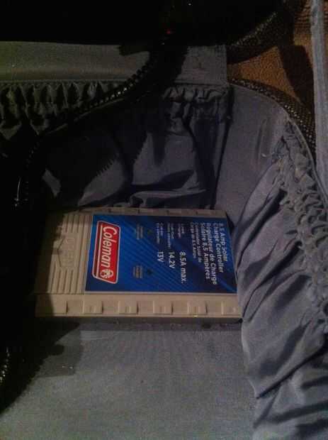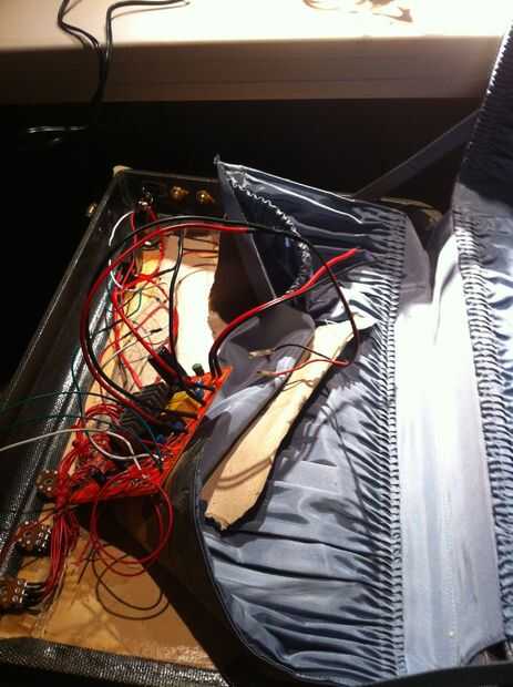 Para cable de la batería y controlador de carga, alambré simplemente la energía de entrada de la DC jack hembra en el exterior de la maleta a la entrada del regulador de carga. El controlador de carga tiene dos salidas de carga de 12v que comparten el mismo circuito. Yo por cable la batería directamente a una de las salidas y el amplificador a otro. Esto permite que el amplificador a utilizar la energía de la batería y la energía directa de la verruga de la pared en un momento dado. Para asegurar la batería dentro de la caja, simplemente utilicé 3 soportes en 'L' y había atornillada en el interior de la maleta alrededor de la batería.