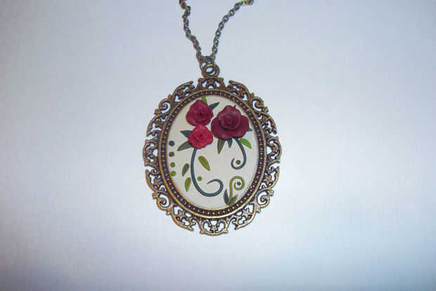 Este colgante de aspecto vintage está hecha de arcilla polimer y una base metálica.