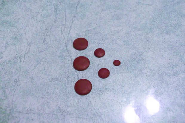 De cada color hacer tres rodillos de diferentes diámetros. De rodillos con el diámetro más grande, cortar tres discos. De la media, dos discos y de la más pequeña, corte un disco. Tesis se utilizará para formar las hojas.
