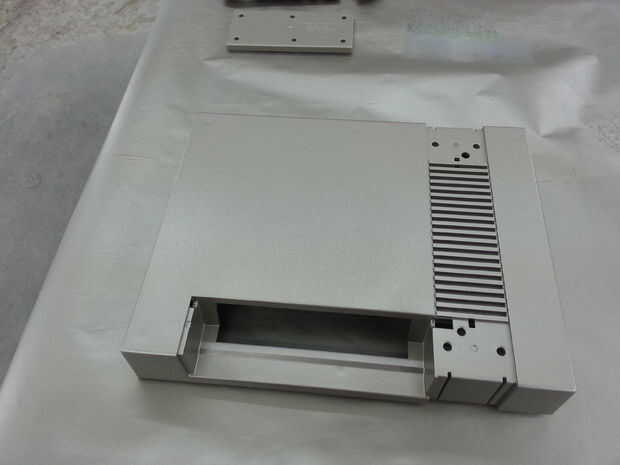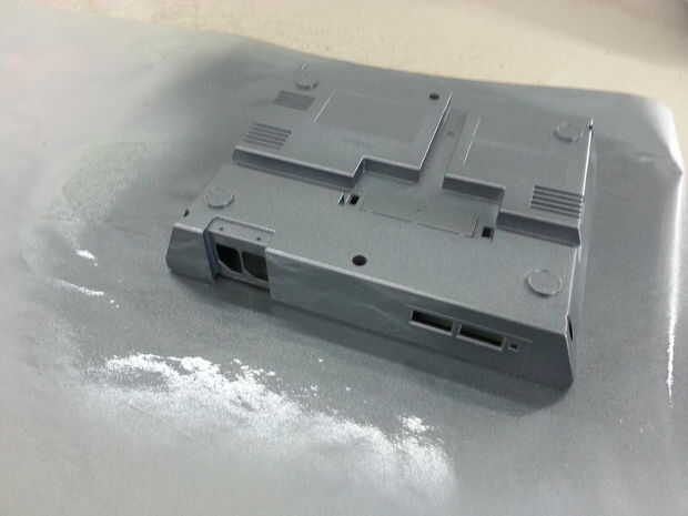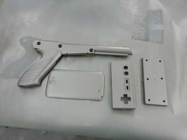 Descuidado tomar imágenes de la ruptura del proceso pero es bastante sencillo (lo siento!). Hay una docena o tan los tornillos en la parte inferior de la Nintendo y en el interior deben ser extraídos. Una vez que la Junta de tratamiento se toma hacia fuera, se quedan con dos partes de la cáscara. La mitad superior, regulador y zapper pistola pinté color beige en preparación para la película de madera del grano hidrográfica. Con la parte inferior, fui con una plata metálica mezclada con un poco de azul para la fibra de carbono. Todas las piezas de acento fueron pintadas con oro metálico. Todo esto fue hecho con pintura automotriz. Parece ser lo mejor para el proceso de hydrodipping y permite un trabajo de pintura durable una vez que se realiza.
