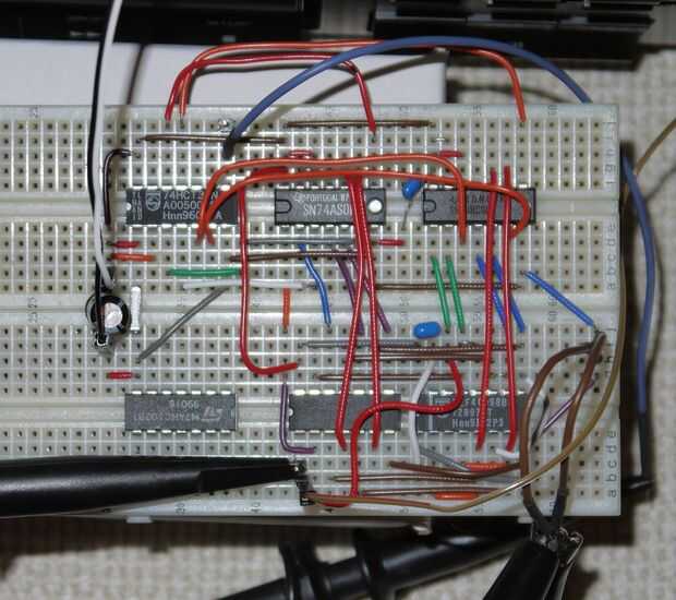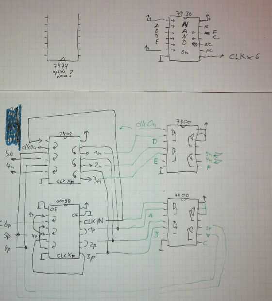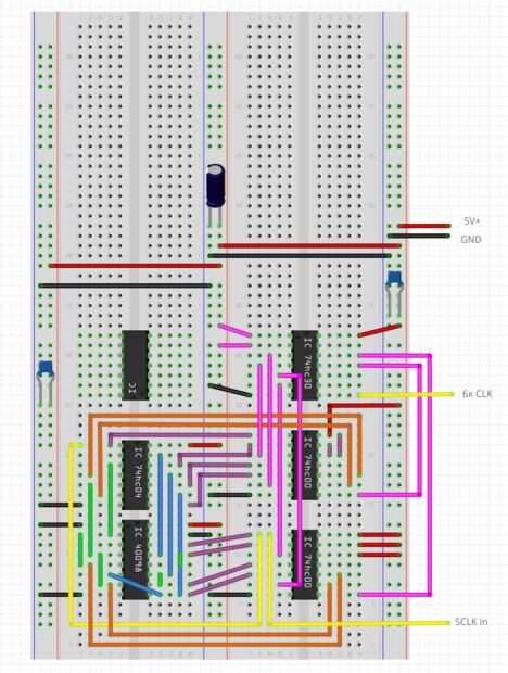 La y es realmente NAND 74hc00 ICs (eso y con la salida invertida) por hacer el pulso negativo. Para obtener el mismo resultado, estos debe ser AND'ed (N) en lugar de OR'ed. NAND o y no importa porque no me importa la polaridad de relojes final, o al menos yo puedo simplemente inviértala otra vez con el 74hc00 o 74hc04.