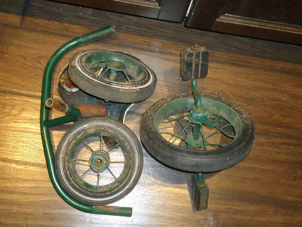 deseo que podría decir que esta moto se transmite en nuestra familia y podría detallar su historia pero no... Nuestros caminos se cruzaron en una subasta del país en noviembre de 2011 cuando vi esta moto poco triste con muchas capas de pintura mal y demasiadas capas de suciedad y moho sentada en el piso de la subasta. Pude comprar por $13 con el objetivo de devolver a su esplendor original para mi hija de 19 meses Dios. Por suerte era completo y doblada ni abolladas en manera alguna que dice mucho sobre su construcción robusta de la vendimia. Algunas partes, como los pedales, tapacubos y barra asidera, fueron demasiado lejos para ahorrar así pasé varios meses buscando en la internet y eBay en busca de las piezas de repuesto correcta. Encontré más de lo que necesitaba pero con los pedales estaba fuera de suerte, eran de un tamaño que no parecen existir en cualquier parte ya.