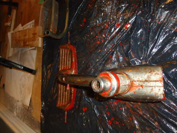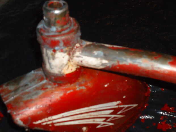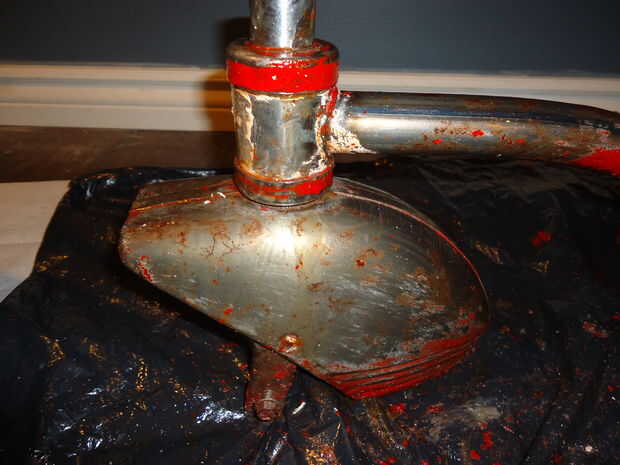 Hubo varias cosas que quería destapar con la pela: el color de la pintura original y el patrón, cualquiera pintar detalles como reflejos o pin-stripes y la "insignia de la cabeza". Casi cada moto tiene una insignia en la barra de soporte delantera debajo de las barras de la manija que muestra el modelo y el fabricante de la moto. Una vez que esto es más fácil hasta la fecha y la historia de la bicicleta de pista. En los primeros días (hasta la década de 1960) estas insignias donde generalmente metales como el latón. Superior final bicicletas, incluso hoy en día, todavía tienen intrincados insignias de la cabeza. Bicicletas masa más barato producidos a partir de los años 60 usar pegatinas para la divisa principal. Ya que hay varias capas de pintura en mi bici no sabría decirte lo que estaba allí hasta que la pintura fue despojada.