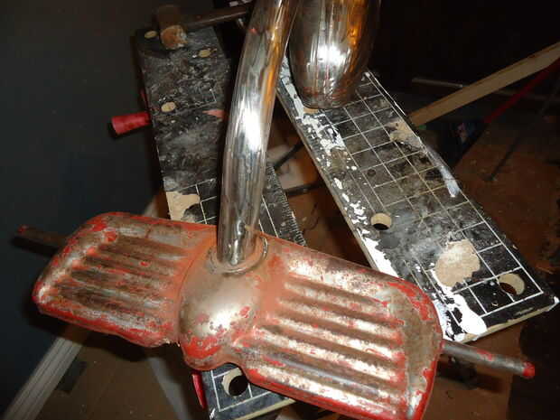 Una vez bajé la pintura hasta el final original era capaz de ver que era un originalmente un bomberos tradicional triciclo rojo con detalles en blanco debajo de las barras de la manija y un gráfico en blanco en cada guardabarros. Tomé varias fotos digitales alta resolución del gráfico de defensa por lo que pude cargar en un programa de gráficos para ser reproducido.