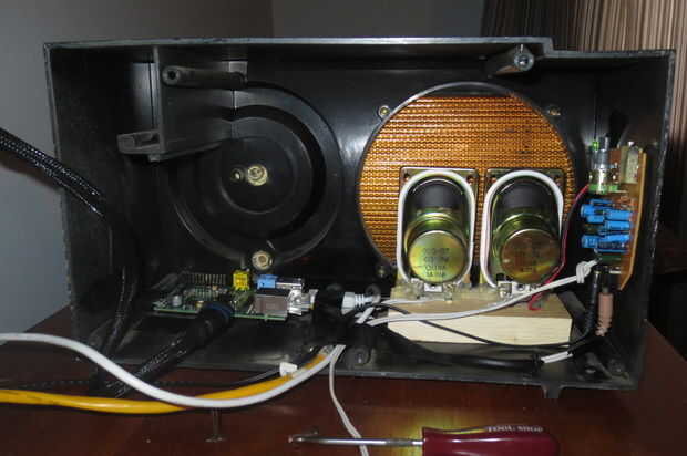 Montaje de la frambuesa pi es fácil todo lo que tienes que hacer es conectar a todos sus cables y coloque la frambuesa pi donde quiera que está al otro lado de la radio (el lado sin nada en él). Luego la cinta abajo todos los conectores para que la frambuesa pi está firmemente en su lugar. Por conectores me refiero a la cabeza del cable Ethernet que se pega fuera de la frambuesa pi como un ejemplo. Entonces mover a la parte frontal de la radio, tomar las perillas que quitó antes y utilizar pegamento caliente para poner en lugar.