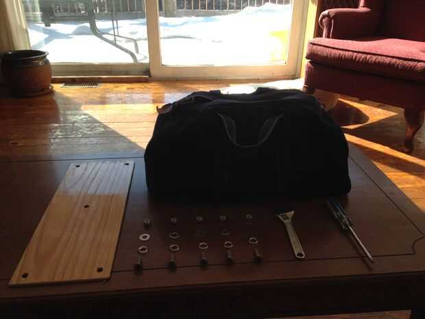 Esta bolsa tenía originalmente una pieza de contrachapado en la parte inferior para darle una estructura y unas patas de metal. Después de haber utilizado un poco, ese poco de contrachapado es muy útil. Sin ella la bolsa cede en el centro y hace que usted tiene que cavar a través de esta pila que cae siempre sí mismo para encontrar cualquier cosa. También echo de menos los pies. Los pies no van a evitar que la bolsa se sucio pero que van a impedir que va justo en la tierra. Los pies eran un pie de combinación y un remache que sólo fue clavado en la madera. Estaban al ras con la madera pero no era bonita. Los pies estaban recibiendo bastante duro y perdí un par. También quería la Junta a ser algo fácilmente extraíble porque sospecho cosas pequeñas y suciedad se acumula por debajo de ella. Así que decidí hacer algo diferente y utilice los pernos.