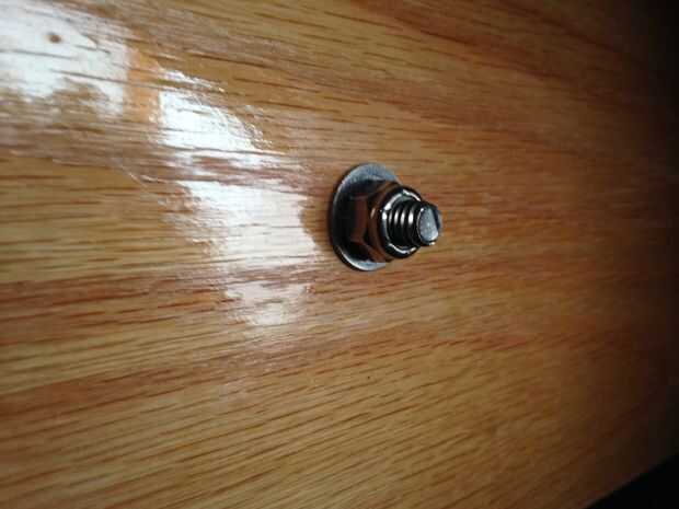 Los pies son cinco pernos de acero inoxidable grande oval cabeza Phillips. Son el tipo de triángulo que se forma en la parte superior con una curva leve en la cabeza. Tengo unos considerables para que ellos sobresalen mucho y que buenos pies. Estas son 5/16". También he añadido algunas arandelas de acabado a ellos para que se vean un poco mejor. En el interior utilicé una arandela y una tuerca de velocidad. Estos tornillos son un poco bajo y pulgadas que era más de lo que quería pero eran más corto que podría conseguir. Como se puede ver se pegan bastante lejos más allá de la planta. Yo podría haber utilizado las tuercas en T y tenía tornillos al ras de la madera pero el tamaño que necesitaba requiere madera más gruesa que yo tenía y sospeché que habría dañado el barniz de la madera contrachapada. Usando las tuercas de una bicicleta podría funcionar bien aquí también. Las tuercas de la moto son a menudo muy finas mientras que estaría orgullosos de la madera contrachapada sólo sería 1/8 orgulloso. Tienes que mendigarles y encontrar pernos roscados sin embargo. Puede resultar difícil. Yo podría cortar los tornillos con un pequeño corte rueda un día pero voy a ver si realmente ser útiles. Es un bolso de la vela pude ver tener protuberancias en la parte inferior siendo útiles. Podrían guardar rollos de cinta de moverse, tal vez podría utilizarlos para algún tipo de cuerda pequeño almacenamiento ayuda. Nunca se sabe. Sospecho que el tiempo lo dirá y no me gustaría actuar demasiado rápido.