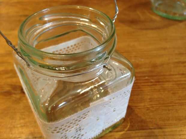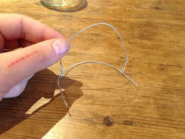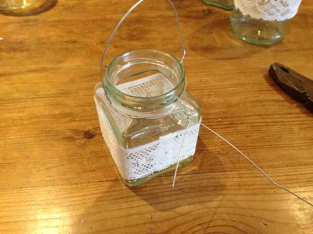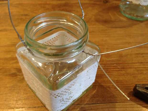 Entonces el otro trozo de alambre a través de ambos lazos de la alimentación, abrigo alrededor de la tapa de la jarra y gire firmemente. Asegúrese de que el alambre está debajo de las líneas que sobresalen de la jarra, para que no se deslice hacia fuera.