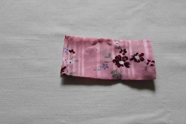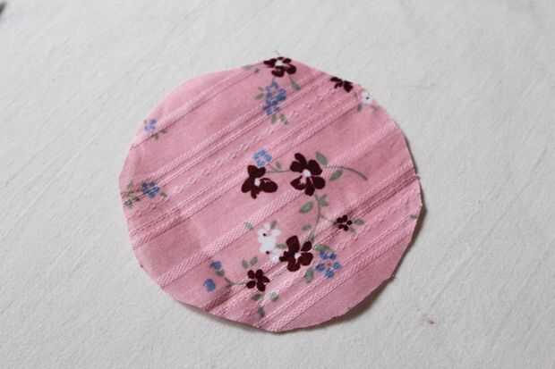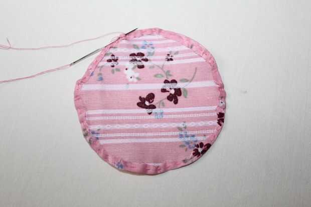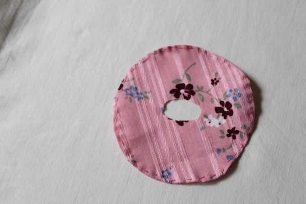 Corte una pequeña ronda con la misma tela, coser alrededor de los bordes, cortados un pequeño agujero en el centro e Inserte el alambre eléctrico y recógelo. Otro pequeño grupo de 2 x 2 pulgadas, doblar en dos y mano coser alrededor sobre él.