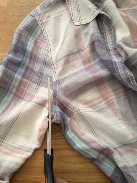 Ponen su camisa fuera plana y cortar ambas mangas, aproximadamente 1cm de la costura de la manga.