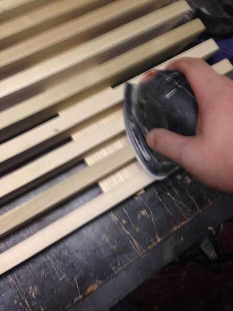 Así que tome usted una lijadora de acabado y entrar en todo, también Asegúrese de que derribar a los bordes de los lamas y largueros para tomar algo de la nitidez de los bordes. Este es un buen paso para tomar incluso si se utiliza como una mesa o un banco.