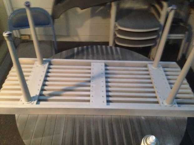 Entonces partiendo de la parte inferior otra vez dispara a color que usted escogió, asegurándose de llegar entre los listones como mejor puede de debajo, voltear la mesa y hacer lo mismo a la parte superior. Déjelo secar y darle una esponja de lija extra fina y arena, repita como sea necesario hasta que estés satisfecho con el producto final.