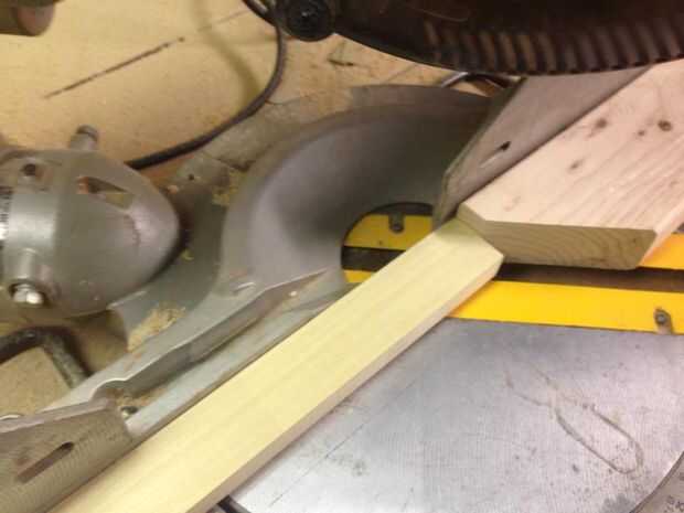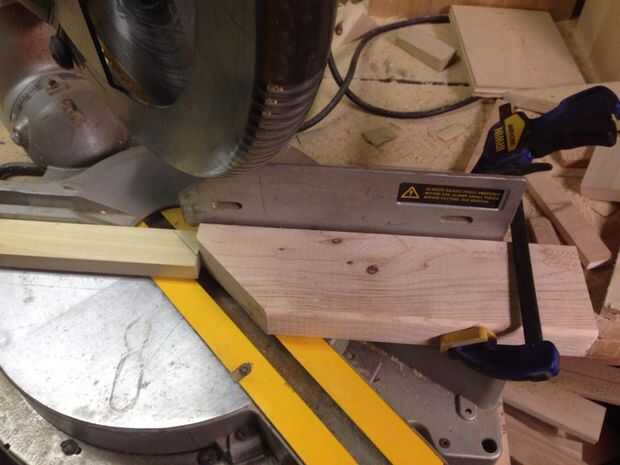 Tomar un trozo de madera que tienes puesta en corte 45, alinee la hoja de sierra con la línea marcada con lápiz en su 1 x 2 x 46" y deslice el tope hacia arriba para encontrarlo, su tope de la abrazadera hacia abajo y hacer su primer corte.