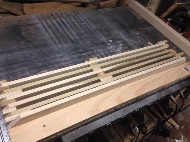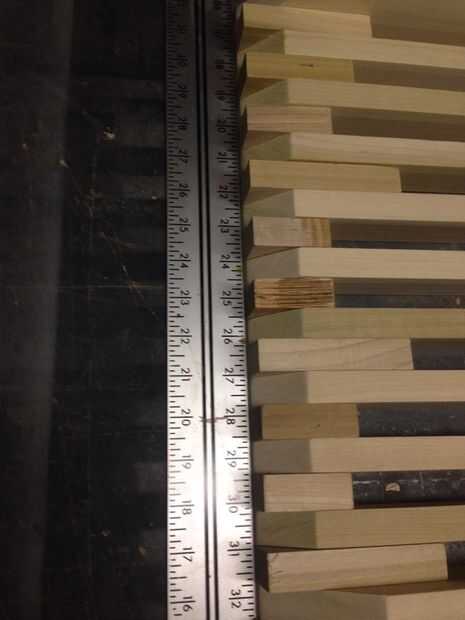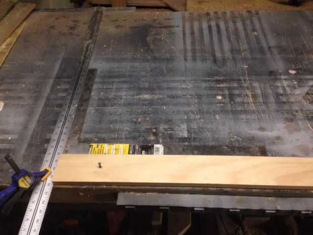 Ahora una vez que la mesa está preparada para la construcción, uno de sus 1 x 3 x 46 y colocarlo hacia abajo contra la madera y quede al final con su plaza de yeso. Lugar 3 piezas de chatarra 1 x 2 a lo largo de la Junta, uno en cada extremo y un solo desplazamiento desde el centro. Colocar la pieza central en el centro, en caso contrario una vez colocar sus piezas de soporte usted nunca podrá salir los espaciadores del centro.