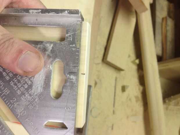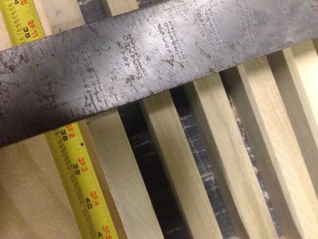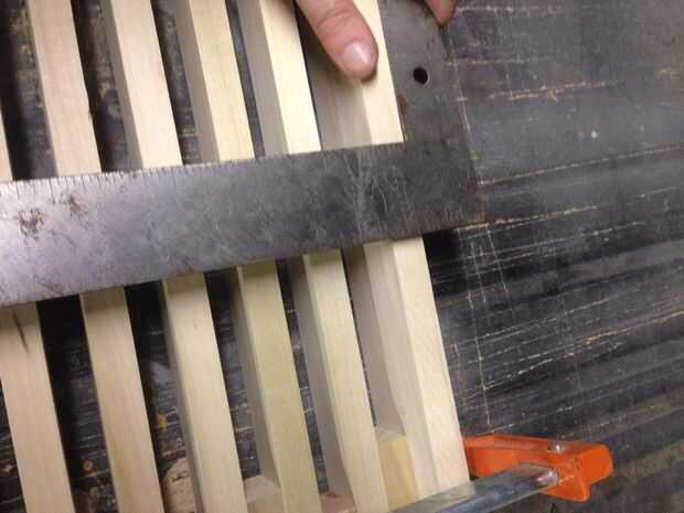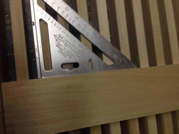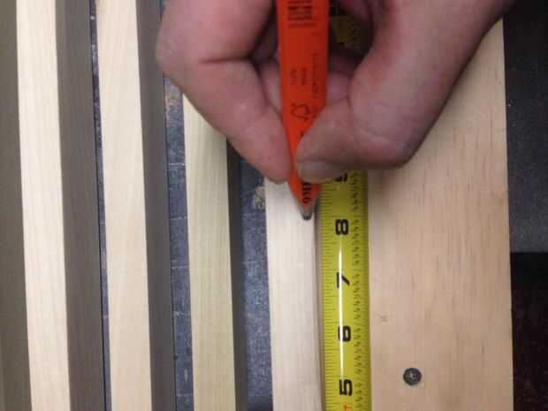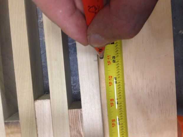 A continuación Asegúrese de que todos tus pinzas son agradable y apretado y toman una medida de la anchura entre de sus dos 1 x 3 x 46, mina salió a ser justo sobre 14 1/4. Tomar tu 1 x 4 x 6' sobre a inglete Sierra y corte tres 14 piezas de 1/4, utilizando el cuadrado de la velocidad marcan el punto de centro de ambos extremos de estas piezas. Traer de vuelta a su mesa y alinee las marcas Cruz de apoyo con las marcas en el 1 x 4 x 14 1/4. Utilice el cuadrado de su velocidad para asegurarse de que son perpendiculares a las tablas externas y utilizar una pistola de clavos para virar hacia abajo la admite.