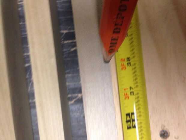 Ahora ejecute su cinta métrica a lo largo de la tabla, haga una marca en su 1 x 3 x 46" a 8" a 23" y uno a 38". Esto uniformemente espaciar la Cruz admite, utilice su plaza de estructura para transferir sus marcas al otro lado